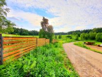 Участок с ландшафтным дизайном. На участке высажены многолетние деревья, туи, оборудована красивая подсветка.