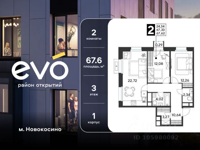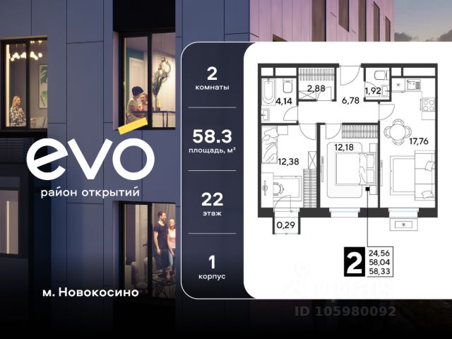 Продается двухкомнатная квартира 60.13 кв.м. в жилом комплексе EVO на 2 этаже по адресу: Московская область, г. Реутов, ул. Комсомольская. EVO - проект комфорт-класса от девелопера Dogma. Каждый житель сможет открыть для себя максимум возможностей. Совершенствоваться во всех направлениях: физическом, эмоциональном и материальном. В EVO можно открыть для себя новые виды спорта, найти единомышленников по хобби, партнеров по бизнесу, развивать в детях новые грани, наслаждаться природой и лаконичной архитектурой. Безопасность - Закрытая территория - Круглосуточное видеонаблюдение - Контроль доступа Расположение Пешком - 7 минут до станции Реутов - 20 минут до метро Новокосино На машине - 4 минуты до МКАД - 6 минут до шоссе Энтузиастов - 9 минут до Носовихинское шоссе - 13 минут до МСД (Московский скоростной диаметр) Более 6 га благоустройства в первой очереди - Зеленый двор без машин, кленовая аллея для прогулок - Нейродинамические площадки для детей разных возрастов - Workout зона, столы для пинг-понга, места для занятия йогой. велодорожки и дорожки для скандинавской ходьбы - Детский сад на 180 мест и школа на 750 мест - Кроссбукинг - Лобби с зоной ожидания, колясочной и лапомойкой - Магазины и кафе на первых этажах Окружение - Реутовский центральный парк, Александровский сквер, Фабричный пруд - ТЦ "Экватор", ТК "Шоколад" - Спортивный комплекс "Старт", Ледовый комплекс "Реутов Арена" - Музей-усадьба "Кусково" Социальная инфраструктура В первой очереди предусмотрено строительство детского сада на 180 мест и школы на 750 учащихся. В 10 минутах ходьбы от EVO находится детский технопарк "Изобретариум", в котором более 60 научных секции: от IT до промышленного дизайна. Для творческих ребят рядом есть художественная и музыкальные школы, хоровая студия. Продам 2-комнатную квартиру первичка в Реутове.
