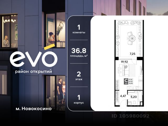 Продается однокомнатная квартира 39.52 кв.м. в жилом комплексе ЭВО на 4 этаже по адресу: Московская область, г. Реутов, ул. Комсомольская. Скидка 15% на выделенный пул двухкомнатных и трёхкомнатных квартир с готовностью в 2026 году!* ЭВО - проект комфорт-класса от девелопера Dogma. Каждый житель сможет открыть для себя максимум возможностей. Совершенствоваться во всех направлениях: физическом, эмоциональном и материальном. В ЭВО можно открыть для себя новые виды спорта, найти единомышленников по хобби, партнеров по бизнесу, развивать в детях новые грани, наслаждаться природой и лаконичной архитектурой. Более 6 га благоустройства в первой очереди! - Зеленый двор без машин, кленовая аллея для прогулок. - Нейродинамические площадки для детей разных возрастов. - Workout зона, столы для пинг-понга, места для занятия йогой. велодорожки и дорожки для скандинавской ходьбы. - Детский сад на 180 мест и школа на 750 мест. - Кроссбукинг. - Лобби с зоной ожидания, колясочной и лапомойкой. - Магазины и кафе на первых этажах. БЕЗОПАСНОСТЬ - Закрытая территория. - Круглосуточное видеонаблюдение. - Контроль доступа. РАСПОЛОЖЕНИЕ Пешком - 7 минут до станции Реутов. - 20 минут до метро Новокосино. На машине - 4 минуты до МКАД. - 6 минут до шоссе Энтузиастов. - 9 минут до Носовихинское шоссе. - 13 минут до МСД (Московский скоростной диаметр). СОЦИАЛЬНАЯ ИНФРАСТРУКТУРА В первой очереди предусмотрено строительство детского сада на 180 мест и школы на 750 учащихся. В 10 минутах ходьбы от ЭВО находится детский технопарк "Изобретариум", в котором более 60 научных секции: от IT до промышленного дизайна. Для творческих ребят рядом есть художественная и музыкальные школы, хоровая студия. ОКРУЖЕНИЕ - Реутовский центральный парк, Александровский сквер, Фабричный пруд. - ТЦ "Экватор", ТК "Шоколад". - Спортивный комплекс "Старт", Ледовый комплекс "Реутов Арена". - Музей-усадьба "Кусково". *Акция действует до 15.02.2026. Подробности уточняйте по телефону. Продам квартиру в новостройке в Реутове.