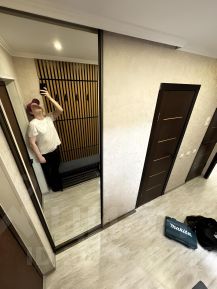 Гардеробная: Просторная отдельная гардеробная комната с большим количеством мест для хранения. При входе в гардеробную также есть зеркало в полный рост, что добавляет удобства при использовании. Под рейками расположена удобная банкетка, которая идеально подходит для комфортного обувания или хранения мелочей.