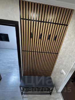 В прихожей установлены стильные декоративные рейки, на которых расположены удобные вешалки для верхней одежды