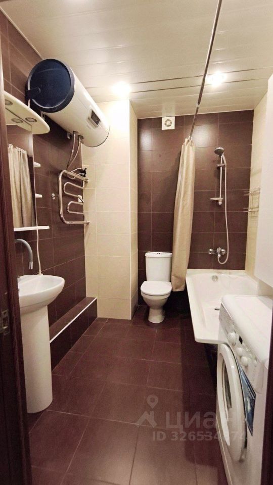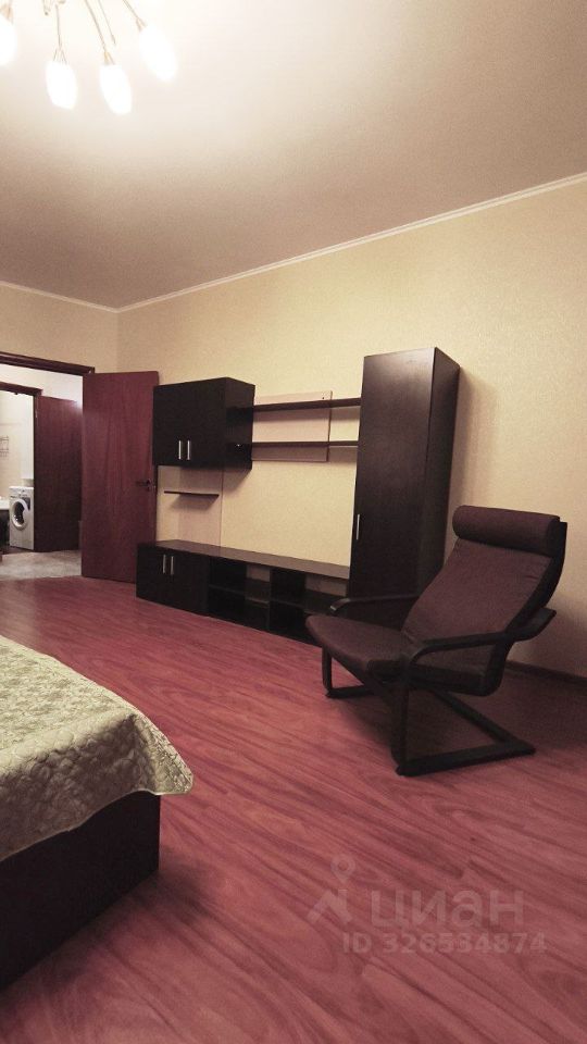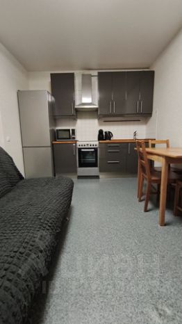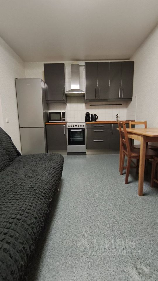 Кухня площадью 12 м² оборудована необходимой техникой: холодильник, плита, микроволновая печь и стиральная машина. Просторная гостиная включает в себя удобный диван и вместительный шкаф-купе. Из мебели также имеются шкафы и спальное место.