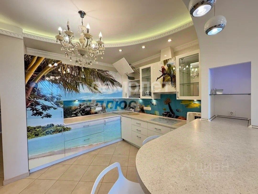 Квартира: 1 изолированная комната, совмещенный санузел и ванна, совмещенная кухня и гостинная. В прихожей большой вместительный 3-х метровый шкаф. Зеркала с дизайнерским узором. Кухня выполнена в морском стиле. Многоуровневая подсветка кухонной зоны и рабочих поверхностей. Барная стойка со стульями и фонарями, свисающими с потолка.