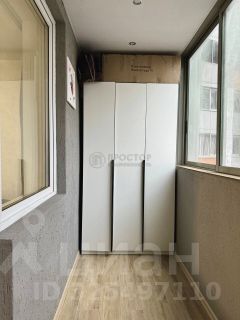 Балкон полностью обустроен: вместительный шкаф, удобная настенная сушилка для белья, тёплый пол и приятный вид из окна.
