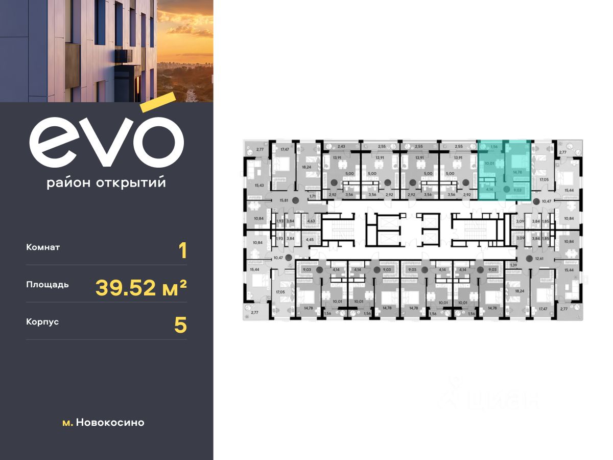 Продается однокомнатная квартира 39.52 кв.м. в жилом комплексе ЭВО на 13 этаже по адресу: Московская область, г. Реутов, ул. Комсомольская. Скидка 15% на выделенный пул двухкомнатных и трёхкомнатных квартир с готовностью в 2026 году!*