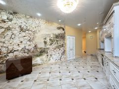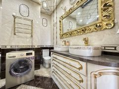 • Остается кухонный гарнитур со встроенной техникой, кроме холодильника. А также мебель в ванной, установленной гидромассажной ванной и душевой, тумбой с двумя раковинами и витражным зеркалом.