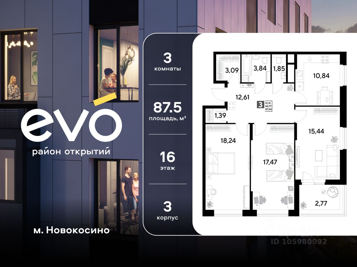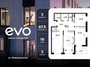 Продается трекомнатная квартира 87.54 кв.м. в жилом комплексе ЭВО на 16 этаже по адресу: Московская область, г. Реутов, ул. Комсомольская. Скидка 10% при полной оплате!*